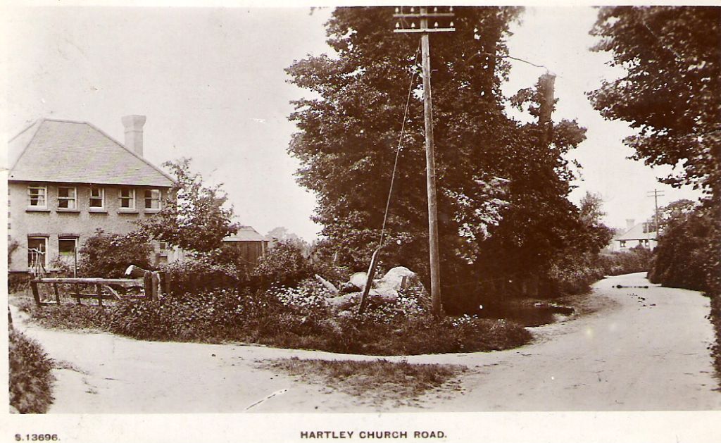 In the past this part of Church Road was much narrower with features such as blind corners to catch out the unwary. The narrowess of the road can be seen in the map which compares the modern map (colour) with the 1955 map (black and while). The postcard shows the road in about 1920 from Stack Lane to the house called "Villa Rosa", near Dickens Close today. Another postcard by Frith shows the road by the RC Church in 1950, where it suddenly narrows, this was not resolved by the County Council until much later. It was very much a country lane with roadside ponds at the end of Stack Lane and outside Mintmakers, both of which have now been filled in.
