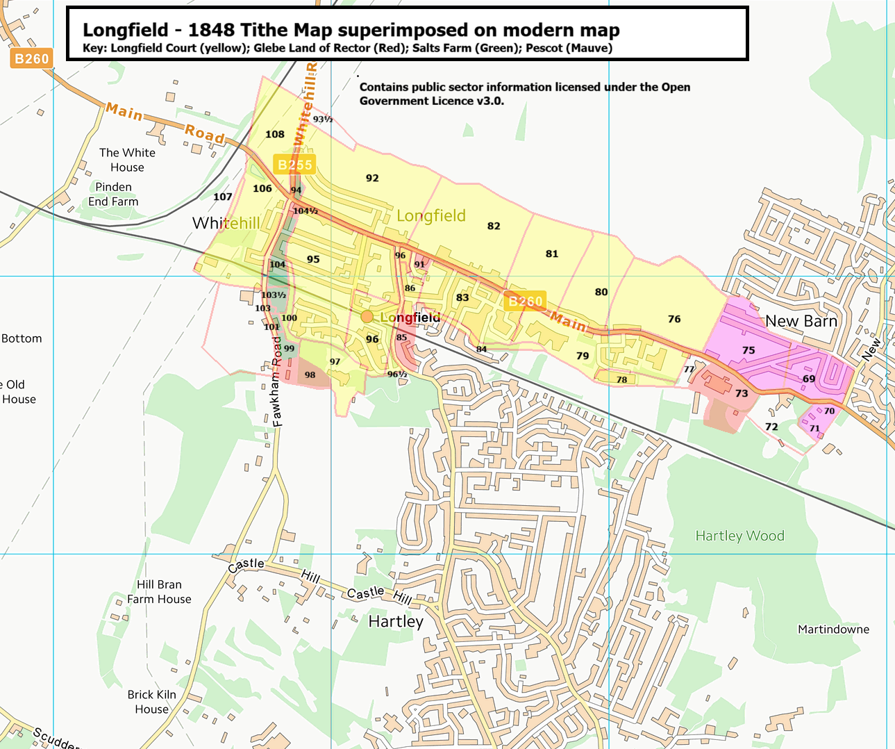 The following is a the tithe map produced under the Act superimposed on the modern OS map. The tithe map covered the whole parish of Longfield, so this is the extract for the village of Longfield.