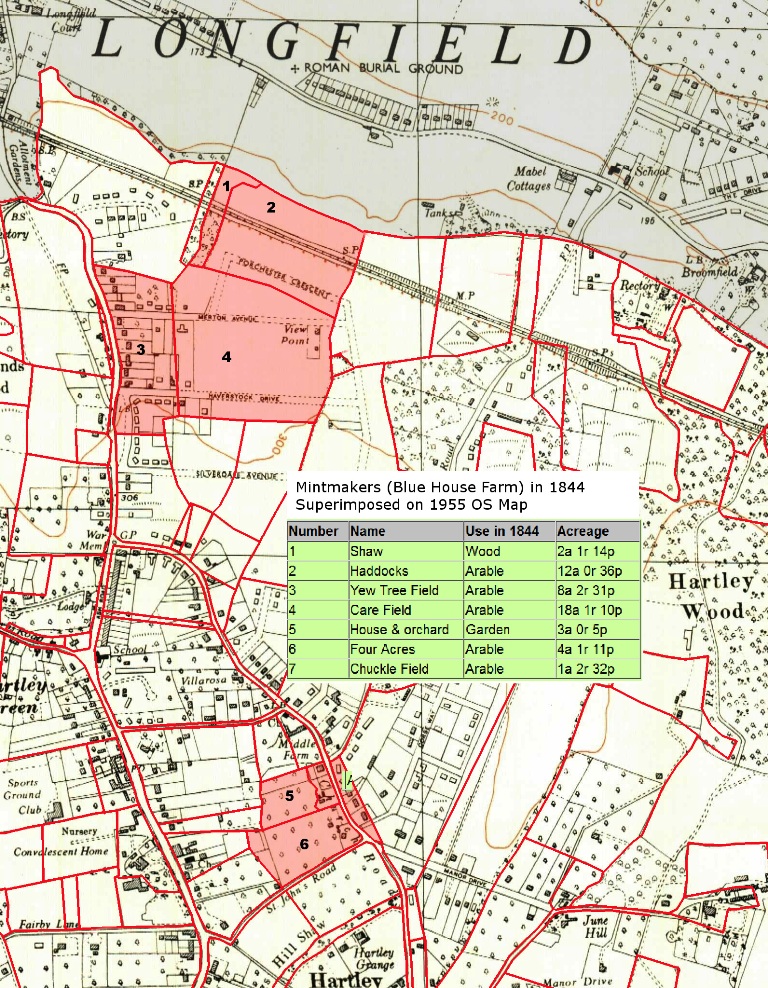 James Swaisland was the owner, when he died in 1851. He left it to his nephews and niece William Wingfield Armstrong, James Armstrong of Southfleet, Mary Ann Armstrong. James bought out the others the following year. By conveyance dated 8 April 1863 he sold nearly all the estate to James Thomas Smith for £3,500, who purchased a large estate in Hartley, which he sold to James Timmins Chance in 1899. JT Chance died in 1902 and his beneficiaries sold the Hartley estate to Thomas Morton on 10 October 1905, just weeks later he had sold 122 acres of that to Payne Trapps & Co.