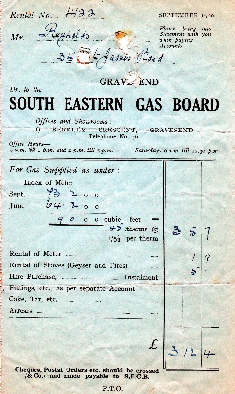 In 1950 the standing chrge per quarter was 1s 9d (9p) and gas 1s 5½d (7p) per therm. In 1976 South Eastern Gas had either a "Gold Star" tariff with a standing charge of £5.50 per quarter and a cost of 14.1p per therm (0.478p per KWh); or "General Credit" tariff with a lower standing charge of £1.25, but higher unit cost of 21.6p per therm (0.737p per KWh). A therm is a unit of heat roughly equivalent to burning 100 cubic feet of gas (the amount of heat generated by one cubic foot varies depending on the composition of the gas). Many people's meters still record gas in cubic feet supplied.